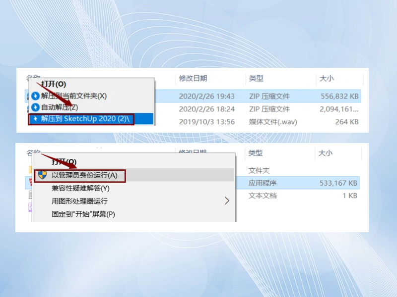 双击打开解压后的文件夹,鼠标右击“1.SketchUpProFull-2020-0-363-132”,选择 “以管理员身份运行”。