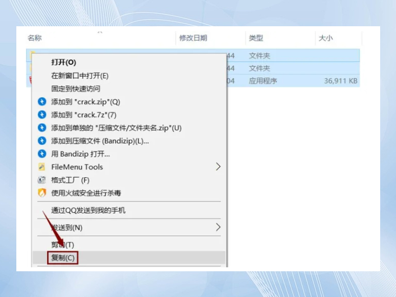 4.打开解压后文件里的“Crack”文件夹,选择所有文件,然后右击选择“复制”。