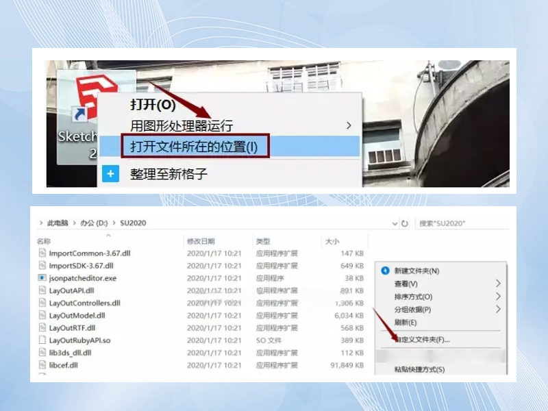 5.鼠标右击桌面的“SketchUp 2020”,右击选择“打开文件所在的位置”, 在空白处鼠标右击选择“粘贴”。