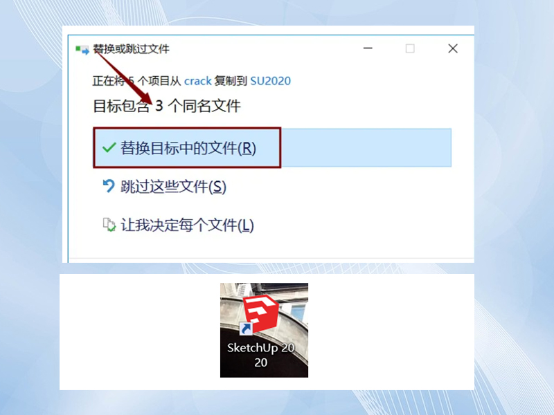 6.点击“替换目标中的文件”,双击“SketchUp 2020”桌面图标。