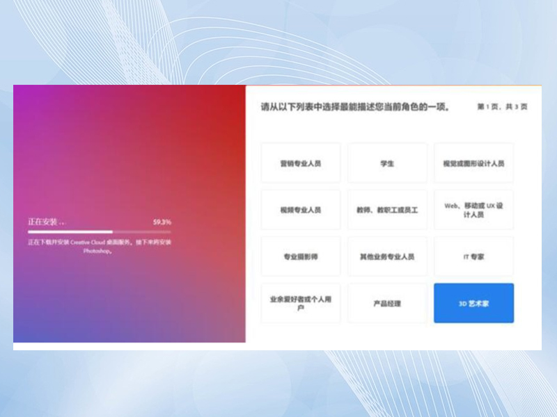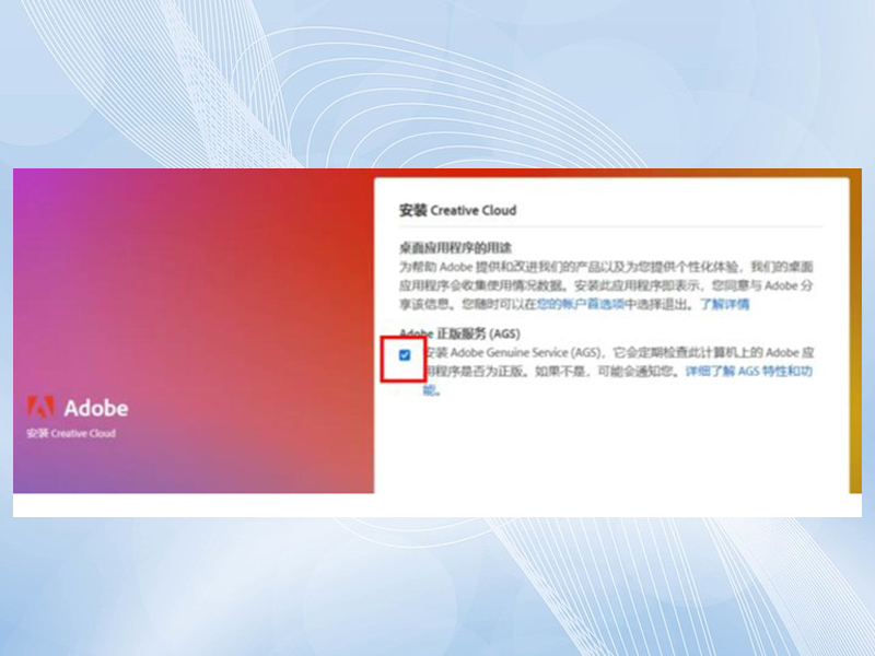 登录后按照引导进行安装。 引导安装需要注意:第一步或者第二步会弹出检测 【adobe正版服务 】 这个窗口,请一定要选择取消勾选!勾选了这个白嫖体验就失效了。