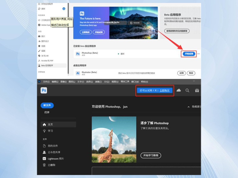 安装后可以看到7天试用。 点击[开始试用]就会打开PS, 注意看photoshop(beta).打开后的界面如下,还是7天试用。